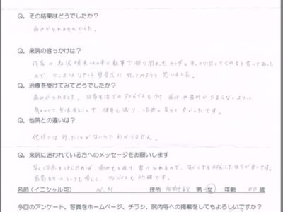 Q.来院される前はどのような症状、悩みがあったのですか? 頭痛と肩こりと背中の痛み Q.そこに対して今までどんなことをしましたか? 肩や首の体操 Q.その結果はどうでしたか? 痛みがとれませんでした。 Q.来院のきっかけは? 作家の森沢明夫さんの本に執筆で凝り固まったカラダをすっきり治してくれると...